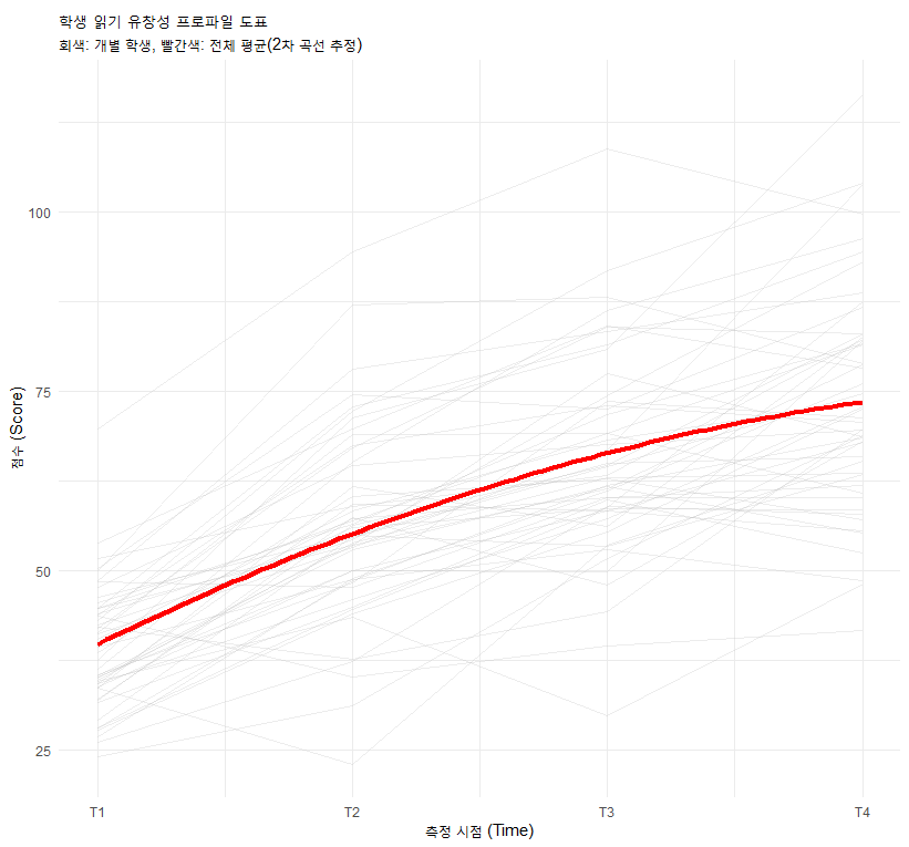 geom_line(alpha = 0.3, color = "blue") + # 개별 학생 곡선