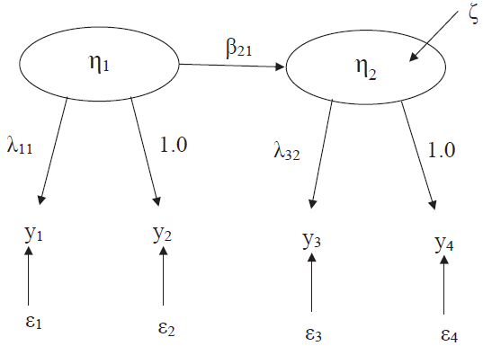 • 구조 모형: 잠재변수 간의 관계는 어떠한가? (예: η=Bη+Γξ+ζ\eta = B\eta + \Gamma\xi + \zeta)