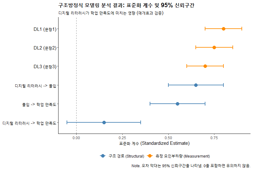 • 대안적 적합도 지수: CFI, TLI (0.90 이상이면 좋음), RMSEA (0.08 이하, 0.05 이하면 매우 좋음), SRMR 등을 종합적으로 봅니다.