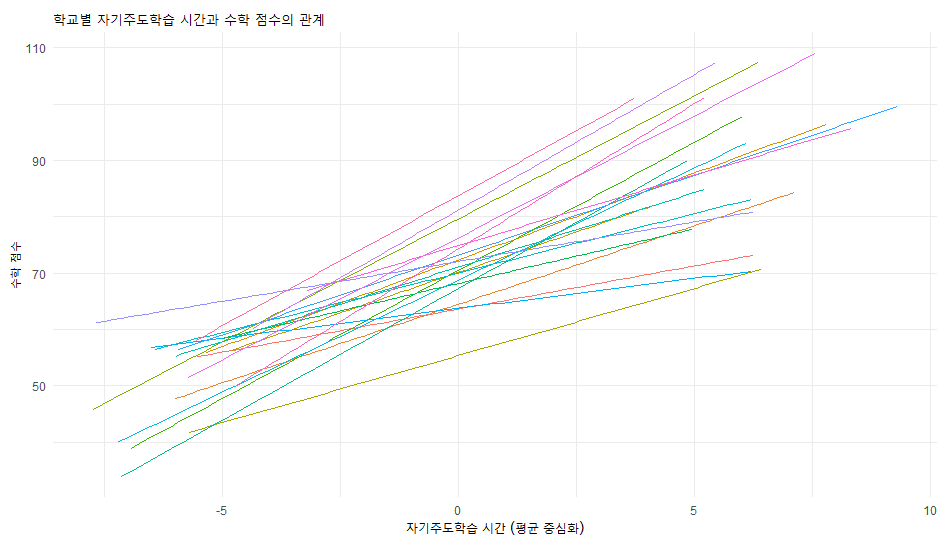 x = "자기주도학습 시간 (평균 중심화)", y = "수학 점수") +