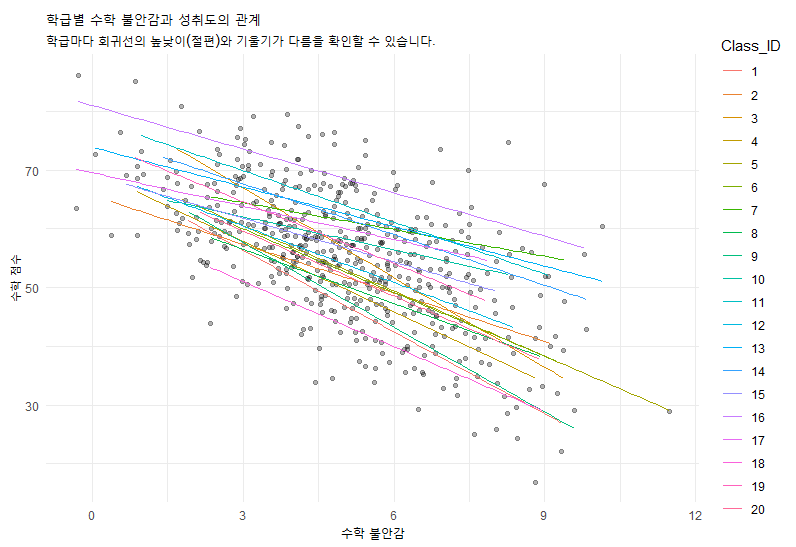 이 그래프를 보면, 어떤 반은 전체적으로 점수가 높고(절편 차이), 어떤 반은 불안감이 커져도 점수가 덜 떨어지는(기울기 차이) 패턴을 볼 수 있습니다.